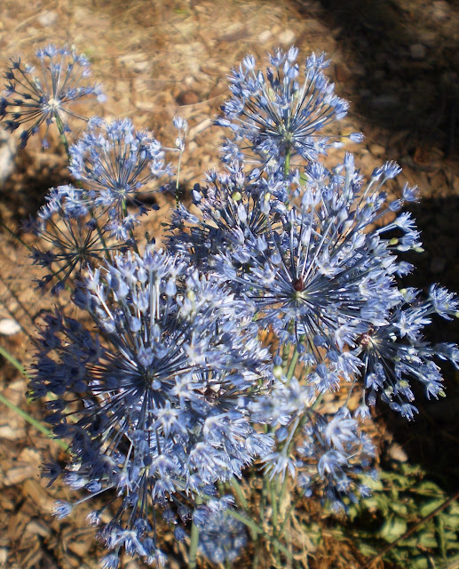 Along with that allium, I have three others blooming now, a yellow, pink, and blue. I love the blue, which is another heirloom bulb I planted last fall, and I'm going to order more of them. This is not a great picture (they started out white and became more blue with time), but it does show the blue color. They are called Caeruleum.
